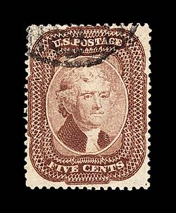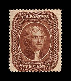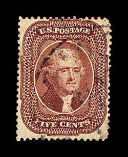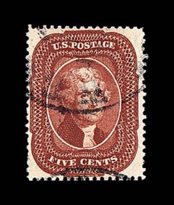 25 O 28A image#28A, 5c Indian red, Ty. I, an exceedingly handsome used example, possessing far better centering and much larger margins than typically associated with this rare and challenging stamp, with virtually all the perforations clear of the projections, in addition possessing marvelously rich and unmistakable Indian red color, highly detailed impression on bright paper, neatly and unobtrusively cancelled with portions of black c.d.s., extremely fine; 1993 PF certificate. (Image) $3,250.00