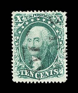 31 O 33 image#33, 10c Green, Ty. III, extraordinarily well centered amid extravagantly wide margins which are most uncharacteristic of this issue, bright color and impression, very lightly cancelled, extremely fine and quite choice; 1989 PF certificate for a pair, this being the left stamp. (Image) $275.00