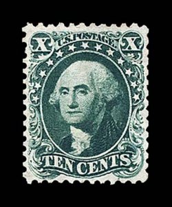 40 og 43 image#43, 10c Blue green reprint, without gum as issued, incredibly well centered and margined for this always difficult value, with its perforations clearing the design all around which is a rare occurrence for nearly all the 1875 reprints of the 1857-60 Issue, sumptuously rich color and a razor-sharp impression on bright paper, extremely fine; few of the 516 issued of this value are found in this exceptional quality; 2002 PF certificate. (Image) $3,000.00