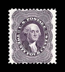 41 og 45 image#45, 24c Blackish violet reprint, without gum as issued, a remarkably well centered example, possessing mathematically precise centering which is terribly challenging to find on any of the values from the reprint series, but especially so on this denomination, and also possessing larger margins than the vast majority of the mere 479 that were issued, strikingly intense color and a prooflike impression on bright paper, an extremely fine and unusually choice example of this difficult value; 1985 and 2000 PF certificates. (Image) $3,250.00