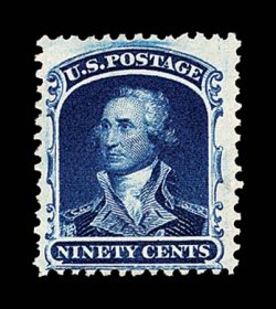 42 og 47 image#47, 90c Deep blue reprint, without gum as issued, wonderfully fresh example of this rare high denomination reprint, possessing beautiful prooflike color and impression on brilliant white paper, quite well centered, fully intact perforations all around which is frequently not the case, very fine and choice example of which only 454 were issued; 2002 PF certificate. (Image) $4,500.00