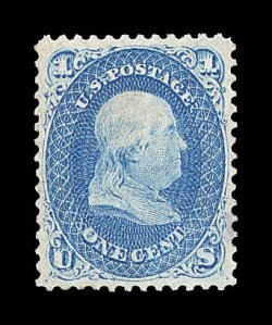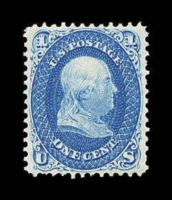 59 ng 92 image#92, 1c Blue, "F" grill, a remarkably choice unused example of this grilled issue, possessing much larger margins than normally found on this value and attractively centered within those lavish margins, incredibly fresh and crisp, with remarkably deep luxuriant color and impression, extremely fine; 1980 PF certificate. (Image) $900.00