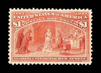 123 og 241 image#241, $1.00 Columbian, a wonderfully choice mint single, featuring exceptionally bright fresh color and vivid impression, precisely centered within large margins and neatly bordered by full even perforations, full o.g., slightly disturbed where hinged, extremely fine; 1993 PF certificate. (Image) $1,250.00