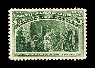 125 og 243 image#243, $3.00 Columbian, a choice mint example with great eye appeal, marvelously well centered within unusually large margins, rich luxuriant and deep yellow green color (certificate specifies deep yellow green) and a well incised impression on bright white paper, full clean o.g., very lightly hinged, minute natural inclusion speck mentioned for accuracy only, extremely fine; a choice original gum Three Dollar Columbian; clear 1994 PSE certificate. (Image) $2,000.00