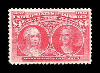 126 og 244a image#244a, $4.00 Columbian, the rose carmine shade, a select mint single of this value, possessing exceptional centering within large margins, plus its color is bright and fresh being an excellent representation of this shade, strong impression on bright white paper, full o.g., only the barest trace of hinging (if at all), extremely fine and a very pretty example of this key high value; 1995 PSE certificate for "generic" #244, carmine lake. (Image) $2,750.00