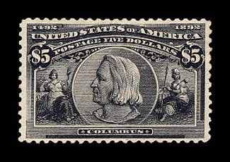 127 og 245 image#245, $5.00 Columbian, handsome mint example of this popular high value commemorative, possessing a desirable overall freshness, with rich color and a prooflike impression on bright paper, very well centered within large margins, full o.g., relatively lightly hinged, very fine and choice; 1975 PF certificate. (Image) $3,100.00