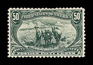140 og 291 image#291, 50c Trans-Mississippi, precisely centered single, fresh and particularly deep color, o.g., relatively lightly hinged, choice very fine. (Image) $700.00