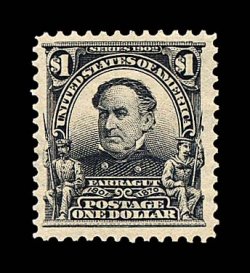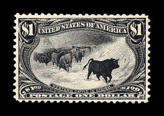 141 nh 292 image#292, $1.00 Trans-Mississippi, well centered single, with strong color and impression, o.g., n.h., light diagonal crease at top left that is barely discernable, otherwise very fine; 1996 PF certificate. (Image) $3,250.00