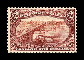 142 og 293 image#293, $2.00 Trans-Mississippi, an exceptionally handsome mint example of this always difficult commemorative, wonderfully bright and fresh, with especially rich luxuriant color and a highly detailed impression, well centered, full clean o.g., quite lightly hinged, choice very fine and quite choice; 1992 and 1997 PF certificates. (Image) $2,100.00