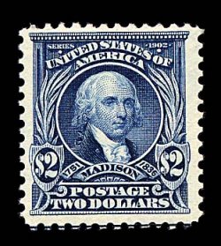 145 nh 312 image#312, $2.00 Dark blue, fresh mint single, deep rich color and a particularly strong impression, quite well centered amid unusually large margins, unblemished o.g. without a single gum bend or skip, never hinged, very fine; a very difficult value to find never hinged; photocopy of a 1985 PF certificate block of four this being the bottom right stamp. (Image) $3,000.00
