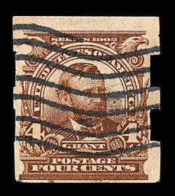 147 O 314A image#314A, 4c Brown, imperforate, Schermack Ty. III perforations, fairly well centered within large margins that are well clear all around, with unusually full Schermack Ty. III perforations showing at right, and virtually complete portions showing at left, strong rich color and an excellent clarity of impression, neat usual wavy line machine cancel, tiny tone speck in bottom margin, not at all detracting, very fine for this incredibly rare stamp.This stamp was issued in April of 1908 at the request of the Schermack Mailing Machine Company in Detroit. The Schermack Company, the largest and most well-known of the private vending and affixing companies, used large quantities of the one and two cent stamps of the period for their private vending and affixing machines. One of their customers, the Winfield Printing Company, placed an order with the Schermack Company to supply them with four cent stamps so that two of their clients, Hamilton Carhatt (a manufacturer of overalls and other men's clothing) and the Burroughs Adding Machine Company, could use the stamps to pay postage for sending their printed matter such as circulars or samples. The Post Office supplied a total of 10,000 of the requested four cent imperforate stamps to the Schermack Company so that the sheets could be cut into strips, pasted together to form coil rolls and then furnished with their well-known "perforations" for dispensing in their machines. No one in the philatelic world was aware of this special order, and had it not been for the fortuitous presence of a Detroit collector named Karl Koslowski, perhaps even fewer of these rare stamps would exist. It is believed that Mr. Koslowski, who learned of these new stamps through a friend at the Schermack Company, acquired 50 of these unusual stamps before departing on a trip to his Latvian homeland. There is some question whether he first saw the stamps in their imperforate form, or he may not have seen them until they had already been cut up and perforated. In effect, virtually the only known examples of this stamp are due to Mr. Koslowski, who retained approximately 20 unused examples and used the remainder on personal mail. There are just a few more known used examples which were taken off the commercial mailings of the Hamilton Carhatt and Burroughs companies, for an approximate total of 45 used examples.The stamp offered here is far better than most of the meager number available of this important rarity. In fact, only a very few of the existing population possess Schermack perforations on both sides of the stamp, as the Schermack affixing machine, when dispensing these stamps, often cut off the perforations on one side. This stamp boasts such perforations on both sides, in addition to being wonderfully bright and lightly cancelled. Accompanied by a clear 1972 PF certificate. (Image) $40,000.00