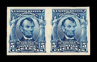 148 og 315 image#315, 5c Blue imperforate, horizontal pair, large margins all around, fresh with rich color and detailed impression, o.g., lightly hinged, extremely fine. (Image) $500.00