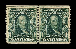 150 og 318 image#318, 1c Blue green coil, perf. 12 vert., an attractive and choice appearing mint pair of this very rare coil with horizontal guide line at top, having centering and margins that are superior to the majority of known pairs, possessing exceptionally rich and luxuriant color as well as a sharp impression, full o.g., lightly hinged, few separated perfs. and small filled thin spot in right stamp, left stamp is sound and very fine, plus the pair overall has very fine appearance; it is believed that there are less than 100 pairs that still exist; 1976 PF certificate. (Image) $14,000.00
