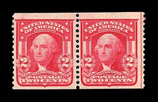 151 og 322 image#322, 2c Carmine coil, perf. 12 vert., a brilliantly fresh mint pair of this rarity, with paste-up at right showing guide line, being one of only three such paste-up pairs recorded, gloriously rich and intense color, outstanding centering which is almost never encountered, o.g., light h.r., extremely fine; the most recent survey in1980 by Martin A. Armstrong found that only 167 had been certified by the Philatelic Foundation, it is our opinion that less than one quarter of this total exist in sound condition and with their perforations not cutting the design, in addition this pair is not only noteworthy for its condition, but is a highly desirable and very rare variety of this important 1908 coil; 1989 PSE certificate. (Image) $12,000.00