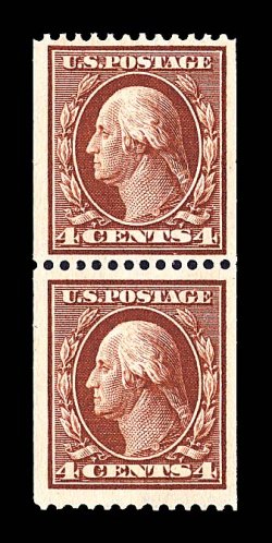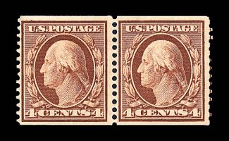 154 og 354 image#354, 4c Orange brown coil, perf. 12 vert., fresh pair with guide line at right, intense deep color with sharp impression, o.g., lightly hinged, very fine and choice; 1990 PF certificate. (Image) $500.00