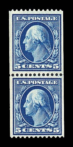 155 og 355 image#355, 5c Blue coil, perf. 12 vert., pair, fresh and crisp, prooflike color and impression, exceptionally well centered within large margins, o.g. extremely fine; 1994 PSE certificate. (Image) $575.00