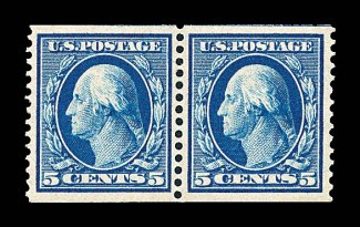 153 og 351 image#351, 5c Blue coil, perf. 12 horiz., handsome mint pair, possessing deep luxuriant color and a strong impression, plus excellent centering as well, o.g., lightly hinged, extremely fine; 1993 APS certificate. (Image) $475.00