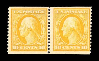 156 og 356 image#356, 10c Yellow coil, perf. 12 vert., an especially fresh mint pair of this important coil rarity, being in a condition that is far superior to the vast majority of known examples, well centered amid large margins, strikingly intense color in a deeper shade than usual, strong fully intact perforations between the two stamps, o.g., choice very fine; 1996 PF certificate. (Image) $6,750.00
