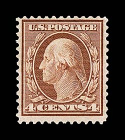 158 og 360 image#360, 4c Orange brown on bluish paper, extraordinarily fresh, luxuriously rich color and a razor-sharp impression on crisp paper, while centered a bit to the top it is actually better and more pleasingly centered than most, full clean o.g. that has been relatively lightly hinged, very fine.A marvelously choice example of this important 20th century rarity, possessing far better centering and overall freshness than the vast majority of known examples. This value, along with the Eight Cent from the series, were never intended to be issued to the public. Approximately 90 of each were released in an exchange with the Post Office Department in Washington, D.C. to obtain other rarities for the nation's collection.An infrequent opportunity to acquire a handsome original gum Four Cent Bluish Paper. Accompanied by a 1971 PF certificate. (Image) $24,000.00
