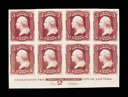 181 ogPB 66a image#66a, 3c Lake, imperforate, an exceedingly rare bottom margin imprint and plate "No. 52" block of eight, with large even margins all around, sumptuously rich color and being incredibly fresh overall, full clean o.g. which has been only very lightly hinged, extremely fine; a great imperforate plate block rarity which Luff states only comes from plate 52; only five #66a imprint and plate number multiples are listed in the Chapin census, one of which is a strip of four and another is a full pane, leaving a mere three full plate blocks available, this being the finest of the three; Chapin census #242; 1975 PF certificate; ex-Col. Green and Chapin. (Image) Est. 10,000-15,000