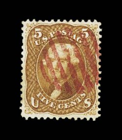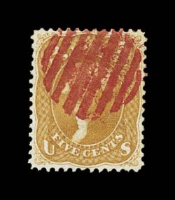 187 O 67a image#67a, 5c Brown yellow, handsome used example, quite well centered amid considerably larger margins than typically associated with any of the various Five Cent 1861 shades, especially fresh and luxuriant color in the brown yellow shade on bright paper, light central red grid cancel, very fine and choice copy of an elusive stamp; 1990 PF certificate as "generic" #67 5c Buff; ex-Koppersmith. (Image) $940.00