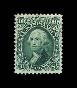 189 og 68 var. image#68 var., 10c Green, a fabulous mint example of this surprisingly difficult and undercataloged stamp, being in a quality that is almost impossible to find, featuring a marvelous overall freshness and crispness, with strikingly intense color in a distinctive green shade, absolutely flawless centering amid margins that are lavishly large, full clean o.g., lightly hinged, extremely fine; a gem in every sense of the word; far rarer in this condition than most collectors realize, although there is an increasing awareness of just how elusive all of the values from the 1861-66 series are in premium condition with original gum; 2002 PF certificate specifically identifying this as the Scott listed green shade. (Image) $900.00