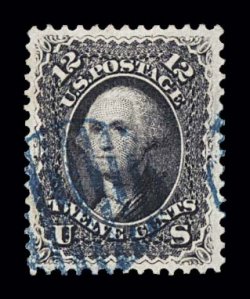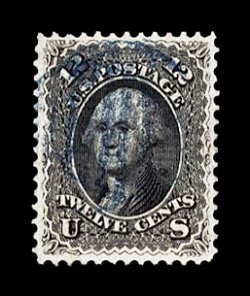 194 O 69 image#69, 12c Black, superlative used example, possessing mathematically precise centering amid very large margins, but contributing even further to this stamp's tremendous eye appeal is its intense color and prooflike impression on bright white paper, dark blue grid cancel enhances its overall appearance, an extremely fine gem for the most fastidious collector; 2004 PF certificate. (Image) $102.50