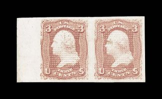 230 og 83a image#83a, 3c Rose, "C" Grill, imperforate, left sheet-margin horizontal pair, wonderfully large margins all around, rich color, full o.g., crisp grill impressions, extremely fine; an especially choice pair of this rare imperforate variety; 1971 PF certificate; ex-Chapin. (Image) $1,850.00