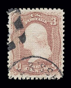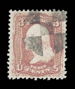 228 O 83 image#83, 3c Rose, "C" grill, used, quite well centered, strong rich color, nicely impressed grill, neat cut cork postmark, very fine and attractive example of an early experiemental grill issue; 1998 PF certificate. (Image) $1,000.00