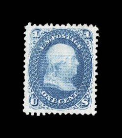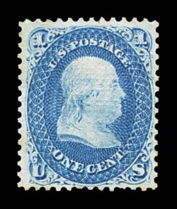 234 og 86 image#86, 1c Blue, "E" grill, incredibly handsome mint example, featuring unusually large margins all around and being exceptionally well centered within them, prooflike color and impression, full clean o.g., and in addition showing a full strong grill, mild natural diagonal pre-printing paper wrinkle/crease at bottom left, otherwise extremely fine for this scarce mint stamp; ex-Chapin. (Image) $3,250.00