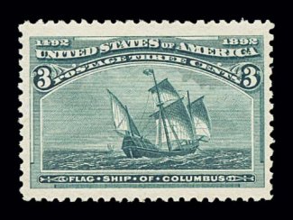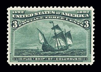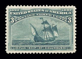 501 nh 232 image#232, 3c Columbian, an exceptionally choice mint single, featuring not only outstanding centering amid extravagantly large margins, but its color and impression are also far more intense than usual on bright crisp paper, o.g., n.h., extremely fine; a stamp with great eye appeal; 1986 PF certificate. (Image) $130.00