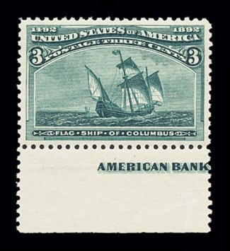 502 nh 232 image#232, 3c Columbian, select bottom sheet-margin partial imprint single, brilliantly fresh, gorgeous rich color and impression on bright white paper, outstanding centering, pristine o.g., n.h., extremely fine. (Image) $130.00