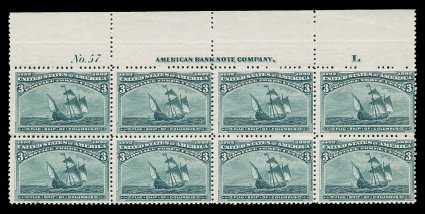 505 ogPB 232 image#232, 3c Columbian, full top margin imprint, letter "L" and plate "No. 57" block of eight, exceedingly fresh color and paper, o.g., lightly hinged, a few perf. separations at top, tiny insignificant spot in the bottom margin of the bottom left stamp, otherwise fine. (Image) $1,200.00