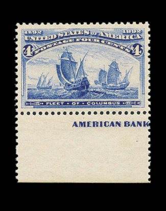 507 nh 233 image#233, 4c Columbian, most impressive full bottom sheet-margin partial imprint single, possessing lavishly large and wonderfully well balanced margins all around, brilliantly fresh color, immaculate o.g., n.h., an extremely fine gem; photocopy of a 1997 PF certificate for a marginal strip of four from which this stamp was taken. (Image) $190.00