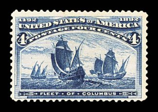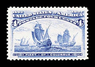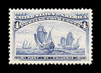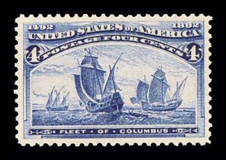 516 og 233a image#233a, 4c Blue Columbian, error of color, an especially rare and desirable sound mint example of this popular commemorative color error, possessing outstanding freshness highlighted by incredibly intense and vivid error color, this being the darker and more desirable of the two error shades in which this stamp can be found, attractively centered, full clean o.g. which has been relatively lightly hinged, very fine for this rare and popular color error; 2002 PSE certificate. (Image) $19,500.00