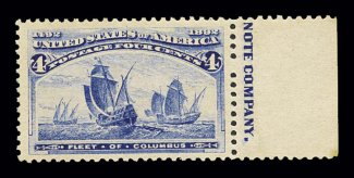 513 nh 233 image#233, 4c Columbian, right sheet-margin partial imprint single, exceptionally well centered within incredibly large margins, rich luxuriant color, o.g., barest trace of hinging, extremely fine. (Image) $87.50