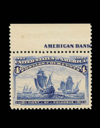 514 og 233 image#233, 4c Columbian, gorgeous top sheet-margin partial imprint single, possessing particularly deep intense color with a prooflike impression not usually associated with this value, perfectly centered within generous oversized margins, o.g. which is just slightly disturbed from a mount, extremely fine; 2004 PSE certificate. (Image) $87.50