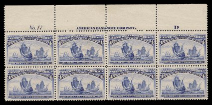 515 ogPB 233 image#233, 4c Columbian, full top margin imprint, letter "D" and plate "No. 17" block of eight, well centered, fresh color, o.g., lightly hinged, a very fine and handsome plate block. (Image) $2,200.00