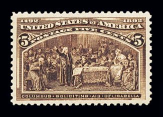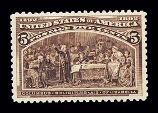 518 nh 234 image#234, 5c Columbian, an incredibly choice mint single that is flawlessly centered amid uncharacteristically large margins, brilliantly fresh and crisp, with sumptuously rich color and a razor-sharp impression on the brightest paper possible, immaculate o.g., n.h., an extremely fine gem for the perfectionist; 1998 PF certificate. (Image) $210.00