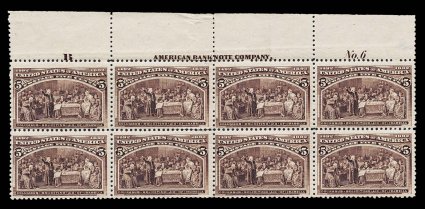 519 ogPB 234 image#234, 5c Columbian, top margin imprint, letter "B" and plate "No. 6" block of eight, strong rich color, nicely centered, o.g., lightly hinged, some wrinkling in the top margin, a few reinforced perfs., bottom right stamp with minor natural inclusion, very fine appearance. (Image) $2,750.00