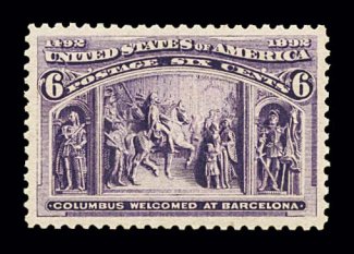 520 nh 235 image#235, 6c Columbian, precisely centered mint single, with unusually large and perfectly balanced margins all around, gorgeous rich color and a crisp detailed impression, immaculate o.g., never hinged, an extremely fine gem for the most demanding collector; 1998 PF certificate. (Image) $180.00