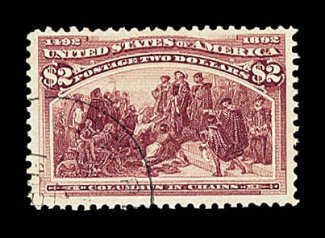 564 O 242 image#242, $2.00 Columbian, a premium used example that is well centered within uncommonly large margins, plus its color is quite deep and its impression especially sharp, all beautifully postmarked with a neat and light town c.d.s. confined to the bottom left, which is more desirable than the typical registry postmark, extremely fine overall; 1995 PF certificate. (Image) $600.00