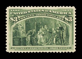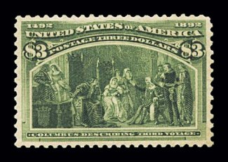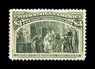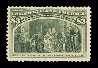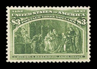 571 og 243a image#243a, $3.00 Columbian, the olive green shade, exceptionally large and wonderfully well balanced margins all around, rich luxuriant color and a deeply etched impression on bright paper, full o.g., extremely fine; 1985 PF certificate; ex-Billington. (Image) $2,000.00