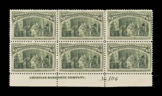 569 ngPB 243 image#243, $3.00 Columbian, an incredibly rare bottom margin imprint and plate "No. 106" block of six, being one of probably only three $3.00 Columbian plate blocks in existence, unused (without gum, as two of the three plate blocks are found), extraordinarily well centered for a multiple, and adding to its overall appeal is its incredibly intense color and outstanding impression, top left stamp with some small thins, otherwise extremely fine; a most impressive appearing example of this great plate block rarity; 1991 PF certificate. (Image) $85,000.00