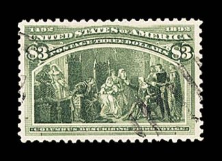 570 O 243 image#243, $3.00 Columbian, a select used example in a quality few used dollar value Columbians are found, being virtually perfectly centered amid uncommonly large margins, with sumptuously rich color, and bearing a light duplex cancel that leaves most of the design unobscured, extremely fine; 1989 PF certificate. (Image) $1,000.00
