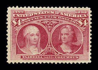 577 og 244a image#244a, $4.00 Columbian, the rose carmine shade, a select mint example of this value, possessing near perfect centering within large balanced margins, lovely pastel color in this distinctive shade, strong impression on bright paper, full o.g., very lightly hinged, extremely fine; 1976 PF and 1992 PSE certificates. (Image) $2,750.00