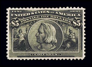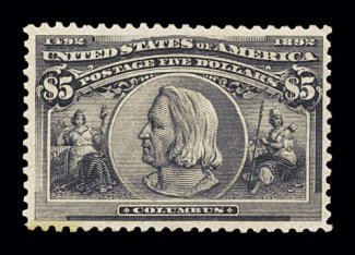 580 og 245 image#245, $5.00 Columbian, handsome and especially fresh mint single of this popular high value commemorative, possessing both excellent centering and large margins, additionally this stamp's color and impression are truly prooflike on bright paper, full o.g., lightly hinged, very fine and exceedingly choice; 1999 PSE certificate. (Image) $3,100.00