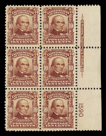 694 ogPB 307 image#307, 10c Pale red brown, full right margin imprint and plate no. 1590 block of six, extraordinarily well centered throughout, rich color, o.g., just a couple of sensibly reinforced perfs., extremely fine and quite handsome; ex-Wampler. (Image) $1,100.00