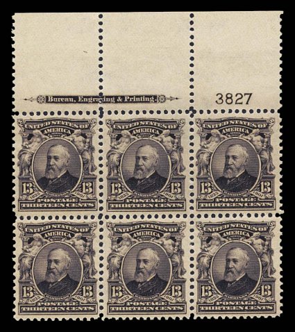 697 ogPB 308 image#308, 13c Purple black, full top margin imprint and plate no. 3827 block of six, sumptuously rich color, especially well centered, fresh and crisp, o.g., faint trace of hinging in the bottom center stamp, others n.h., extremely fine; an exceptionally choice plate block; 1991 PF certificate. (Image) $700.00