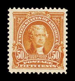 700 og 310 image#310, 50c Orange, striking mint single, well centered with extraordinarily wide and well balanced margins all around, intense vivid color and a strong impression on bright paper, o.g., lightly hinged, extremely fine; an unusually large example of this normally tight margined value. (Image) $475.00